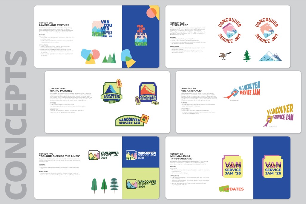 An identity reminiscent of hiking patches and scout team work—rooted in a spirit of collaboration and the freedom to explore and experiment that one thought was lost to our childhood years, with the jar acting as a door to a wider world, as well as a border. A digital patch/sticker system that ensures a versatile logo that can sit atop other elements while looking intentional, as well as alternative stickers or patches that can amplify or clarify the context for social posts and other peripheries. Additional ‘patches’ include a double diamond (a core process in service design), lightbulb, research, spruce tree, and Canadian goose, which ties back to the landscape of the primary logo, with a comical, fun edge.