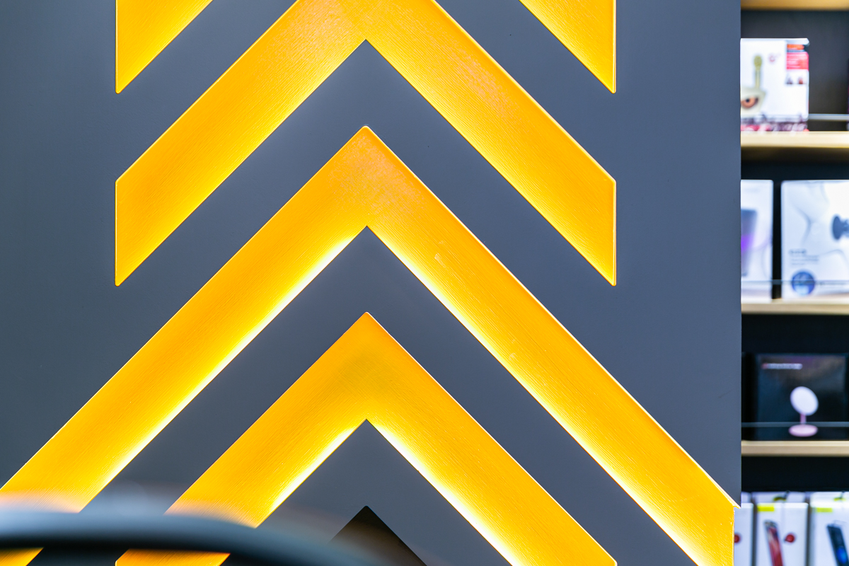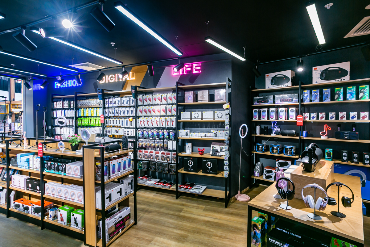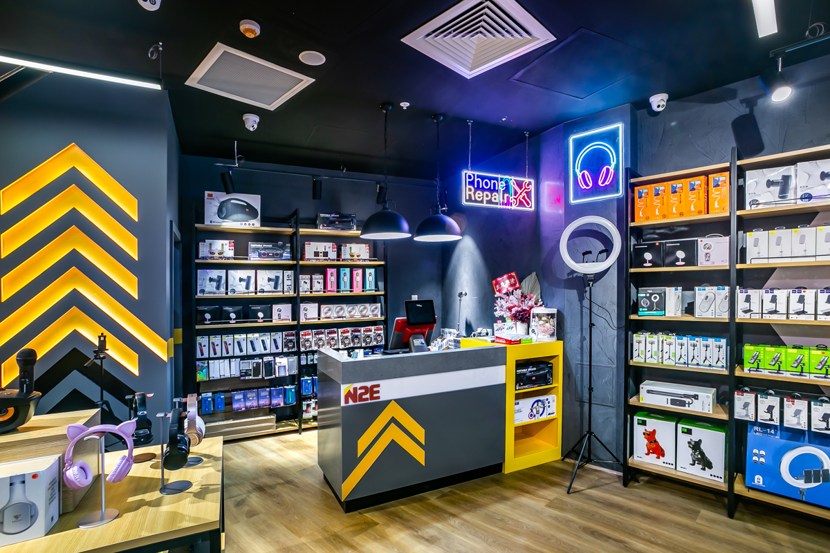 Sometimes a business just needs a small space that’s to the point and function. Here the design not only highlights product categories for easy navigation, but also the quintessential repair station at the back of the store.